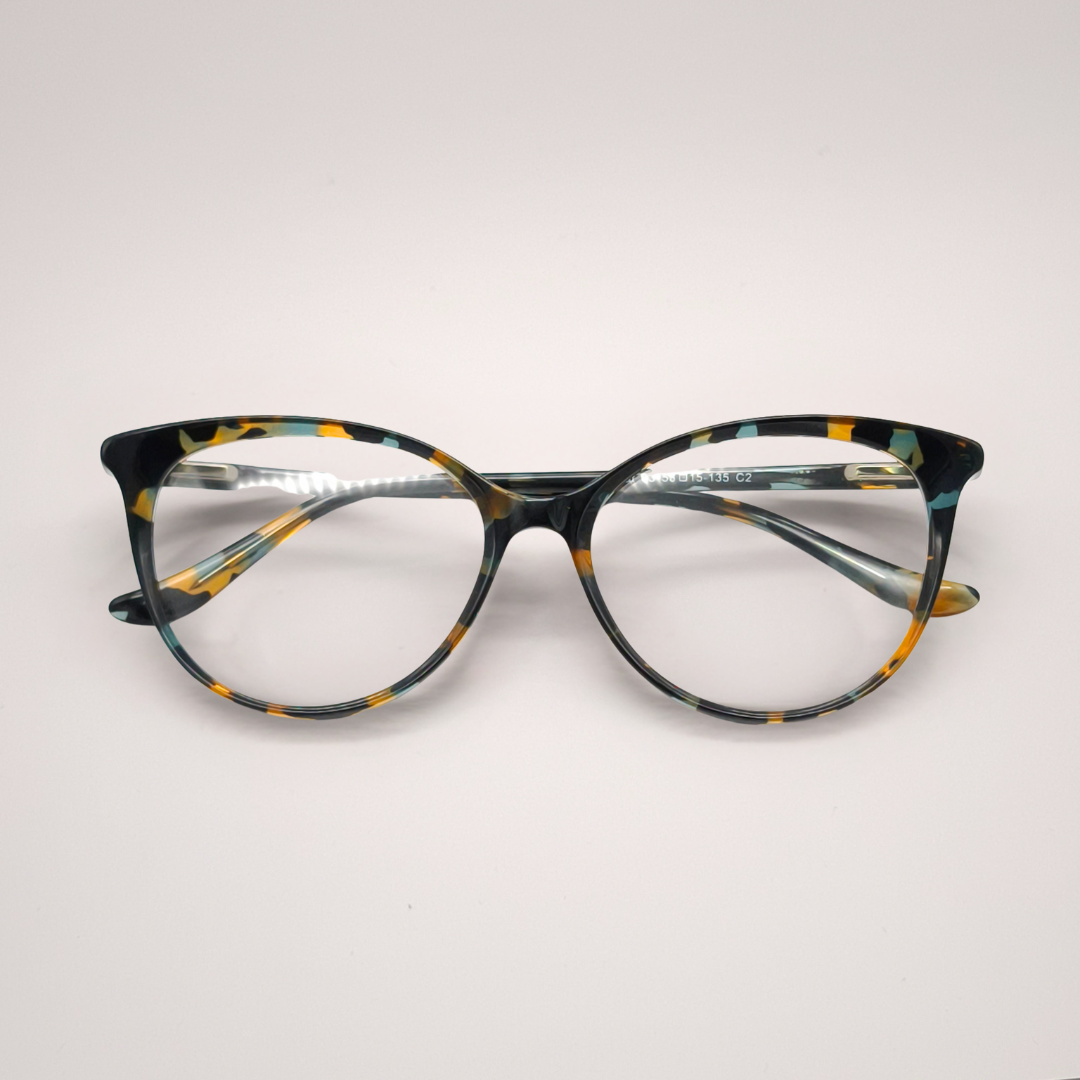 Montura en acetato con brazo en alma metálica y bisagra metálica flexible.